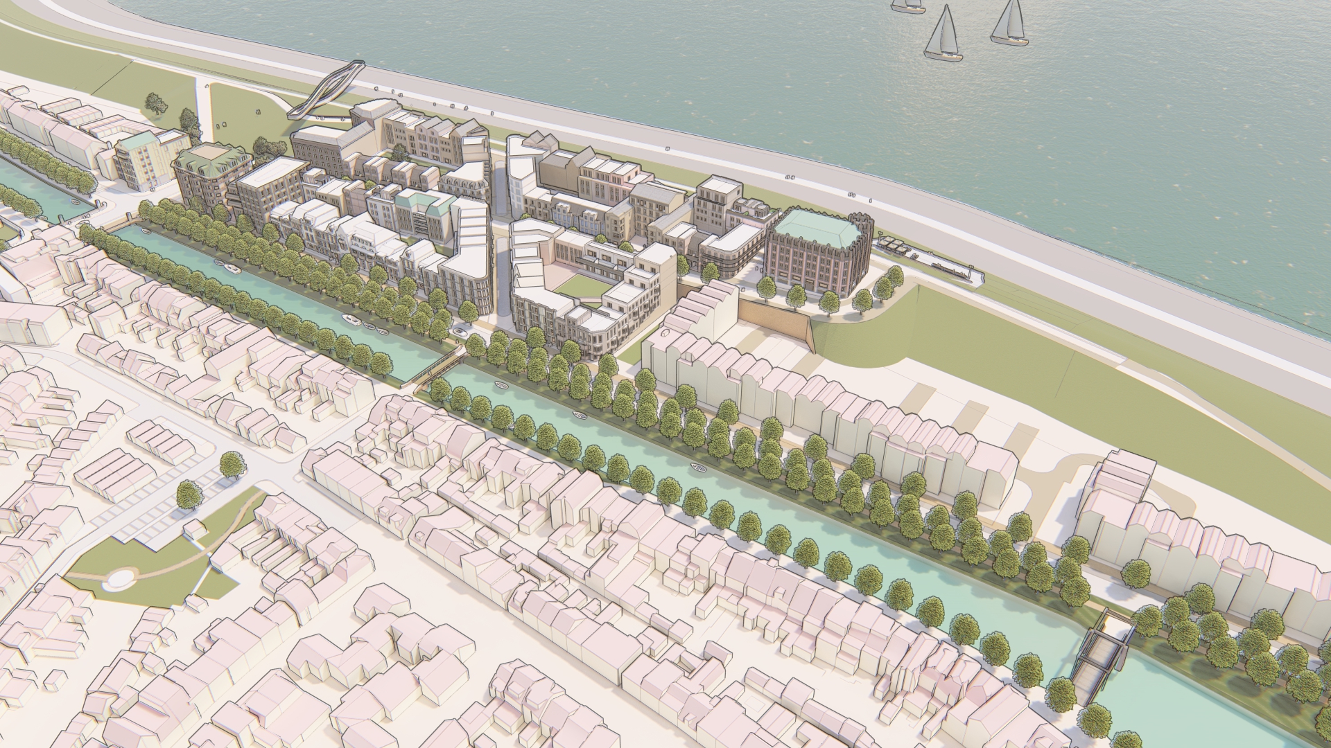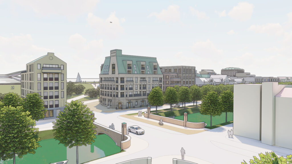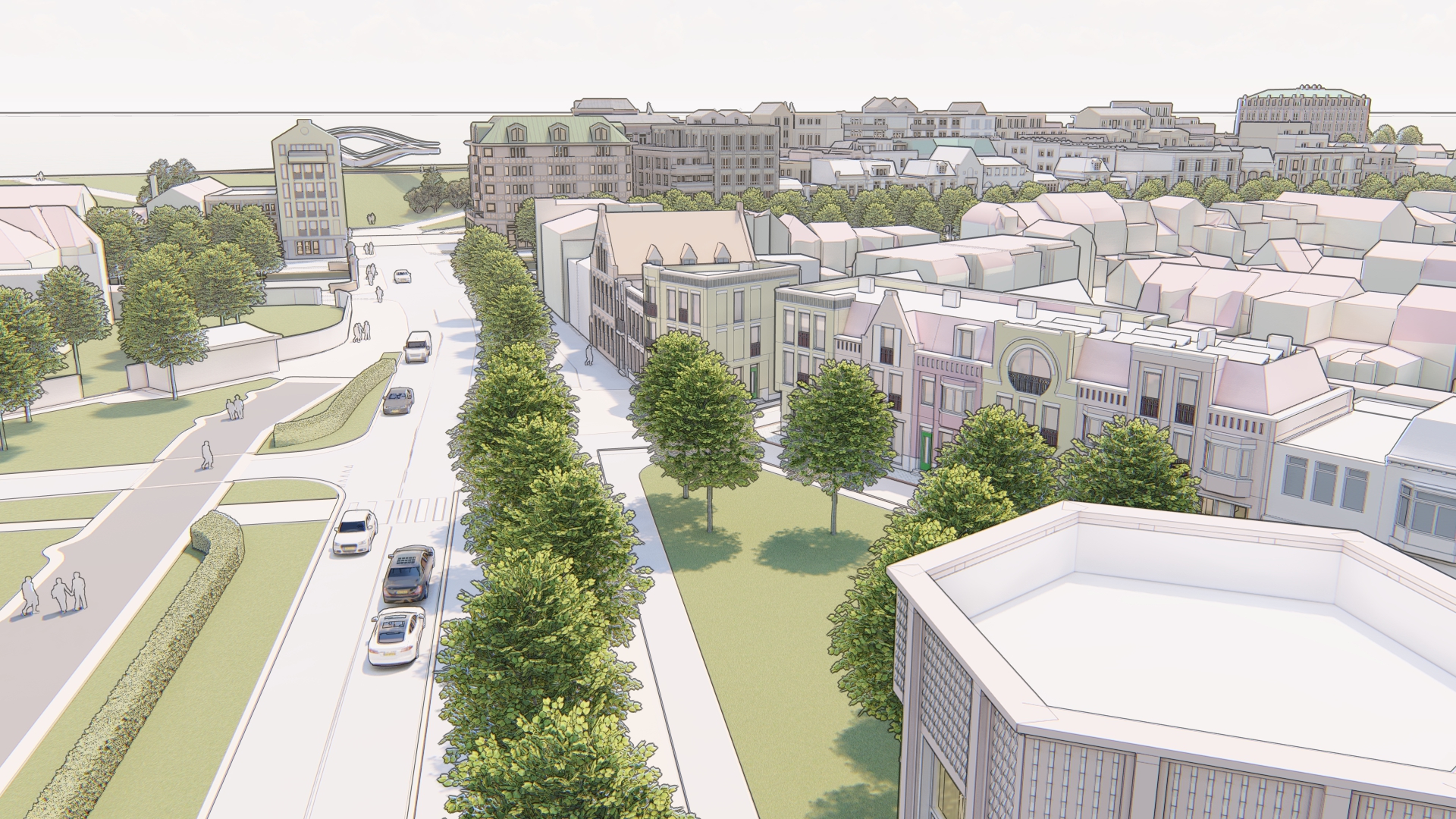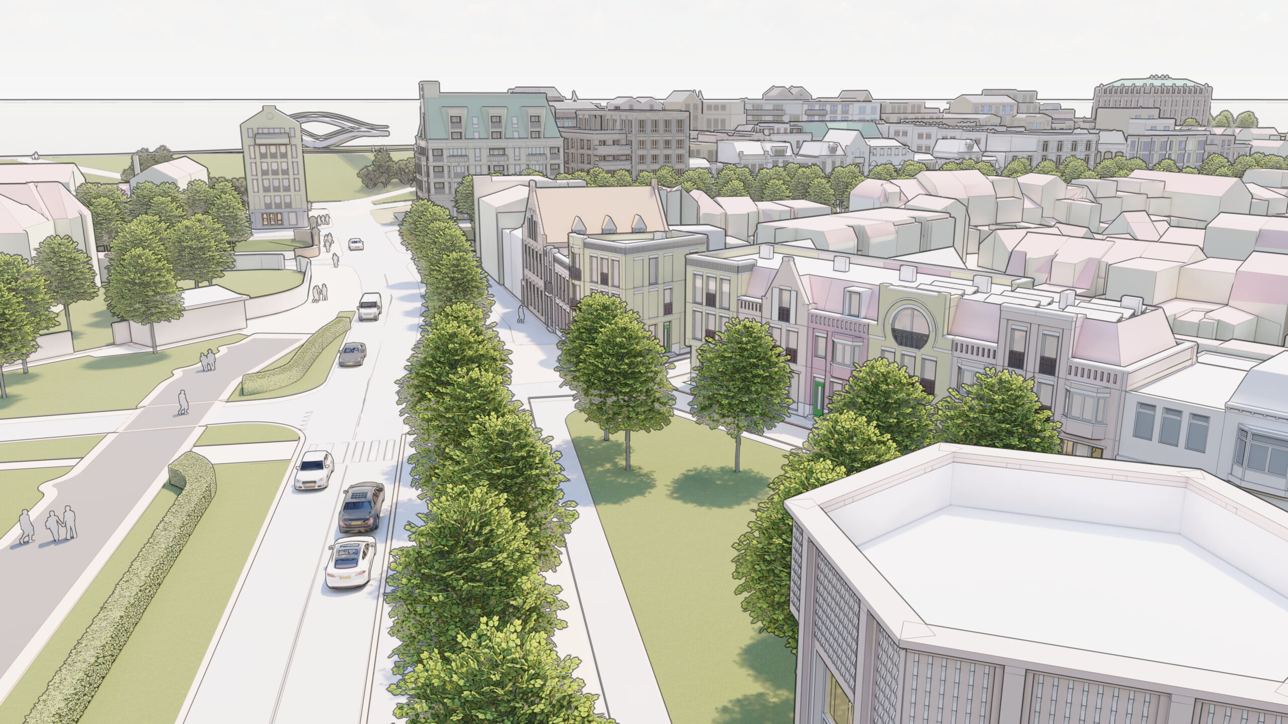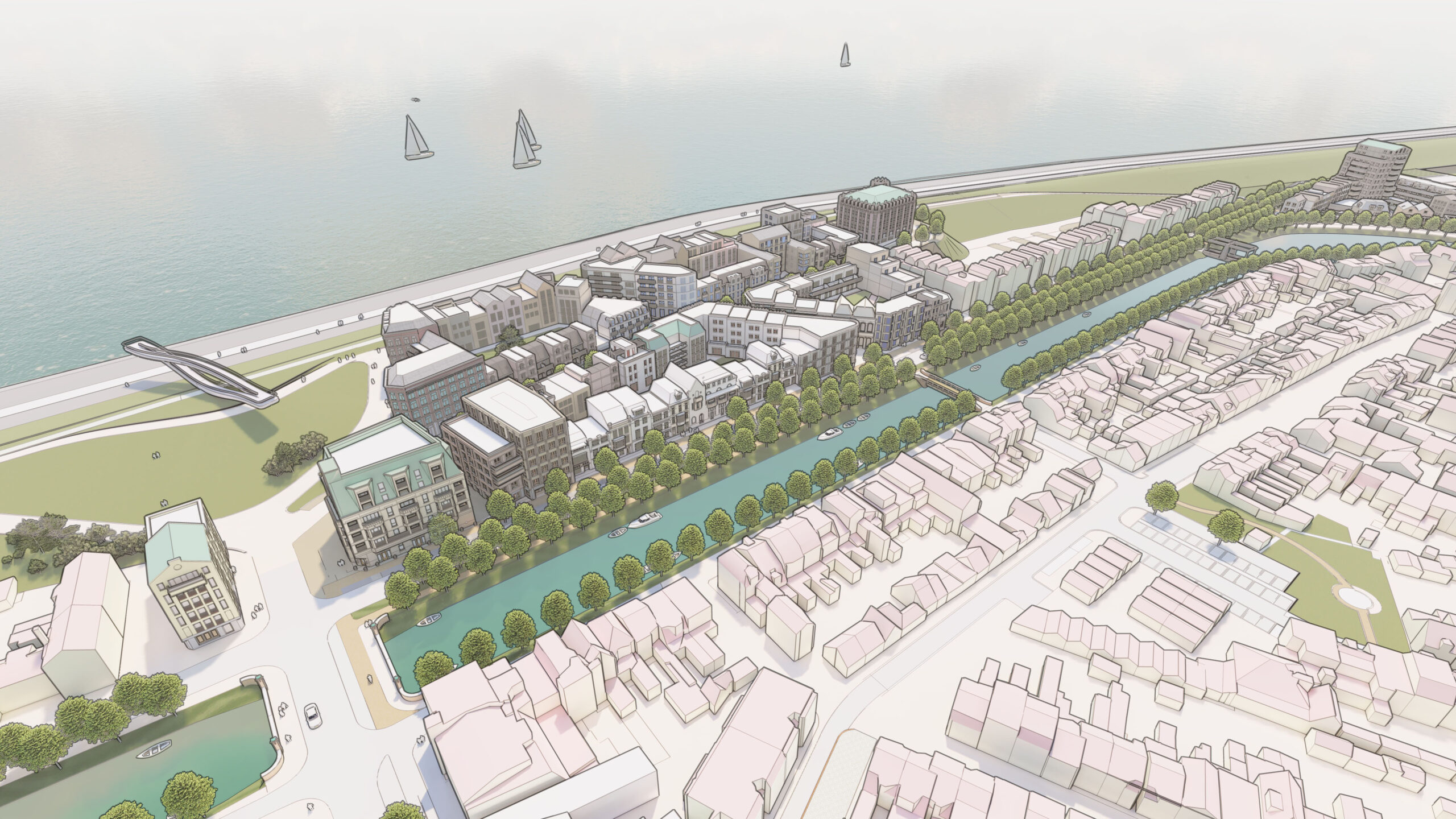 Aan de zeezijde blijft alles zoals het is – daar verandert het uitzicht niet. Aan de kant van de Kanaalweg komen er juist nieuwe open zichtlijnen richting monumenten en de stad. Vanuit de stad kijk je straks uit op een levendige nieuwe wijk, die mooi aansluit op de omgeving.